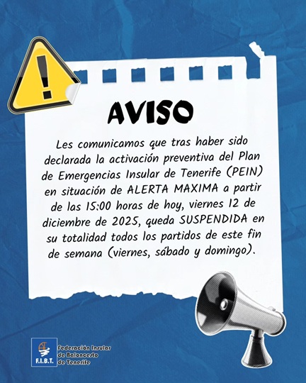 «Que tras haber sido declarada la activación preventiva del Plan de Emergencias Insular de Tenerife (PEIN) en situación de ALERTA MÁXIMA, desde las 15:00 horas de hoy, viernes 12 de diciembre de 2025, queda SUSPENDIDA en su totalidad todos los partidos de este fin de semana (viernes, sábado y domingo)
