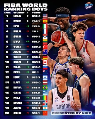 El primer cambio en la clasificación se produce en el puesto número 3, donde Italia superó a Francia. Italia ascendió cuatro puestos en la clasificación anterior tras un excelente verano de 2024, y el país volvió a cosechar excelentes resultados este verano, quedando tercero en el EuroBasket FIBA U18 de 2025 y cuarto en el EuroBasket FIBA U16 de 2025 .