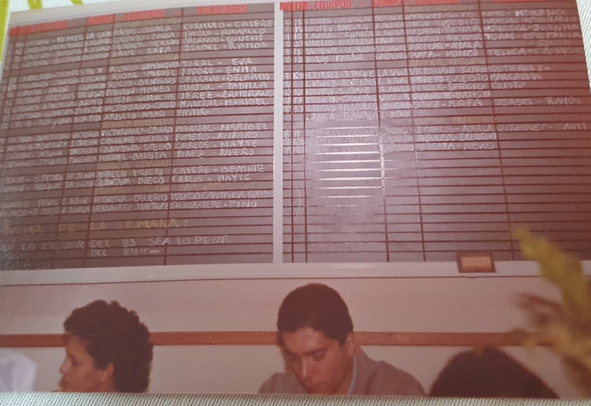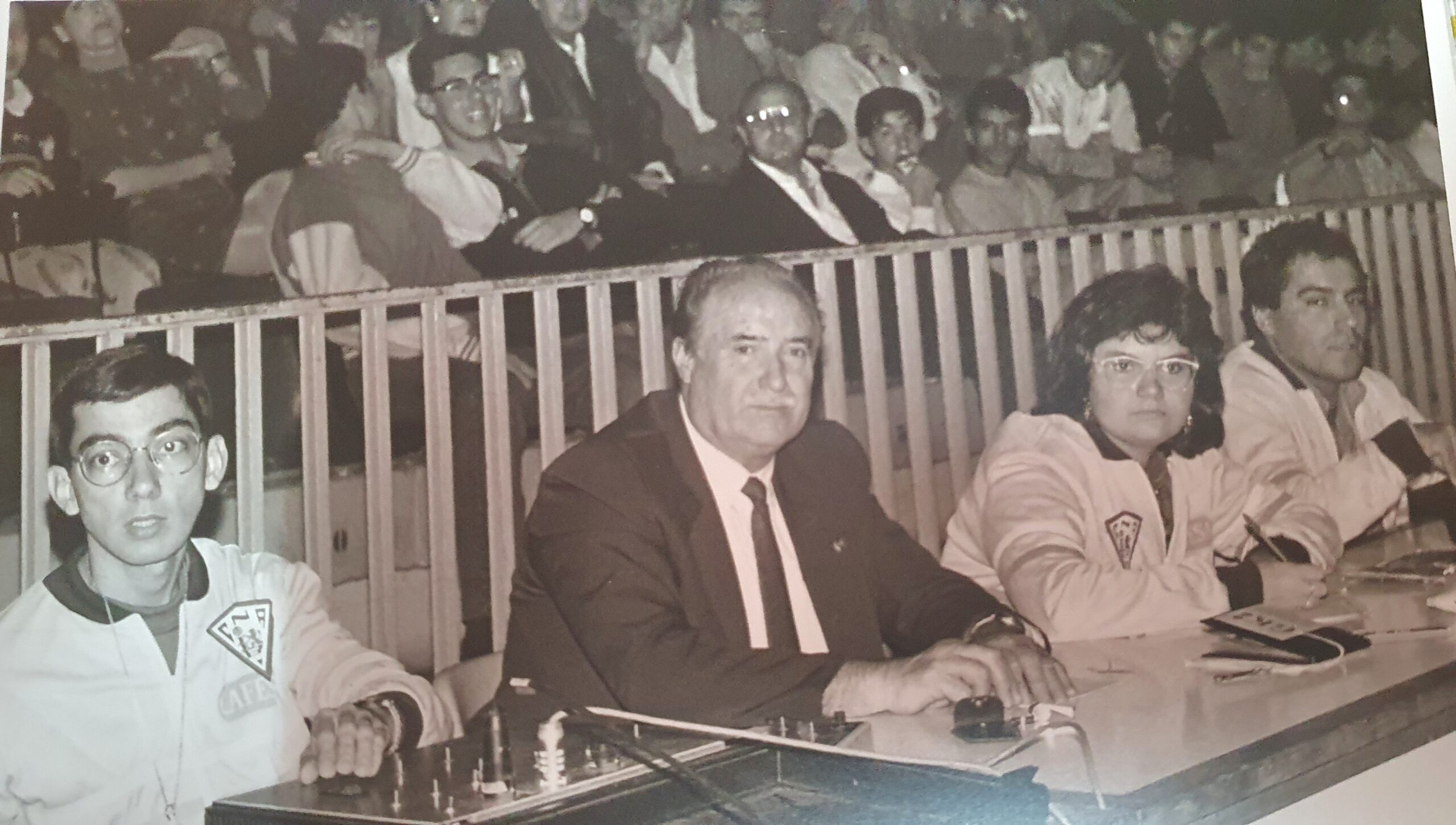 En la década de los ochenta, los árbitros y auxiliares de mesa tenían que darse cita en la sede del Colegio de Árbitros, presidido por Miguel Díez Alegre, para conocer las designaciones. En la pizarra aparecían los partidos de la semana, el horario, los nombres de los dos árbitros y de los encargados de llevar el acta y el crono. Muy diferente a la actualidad, donde las redes sociales mandan. Se gana en tiempo, pero se pierde el contacto con los compañeros. En la foto, los auxiliares de mesa Isabel y Toledo.
