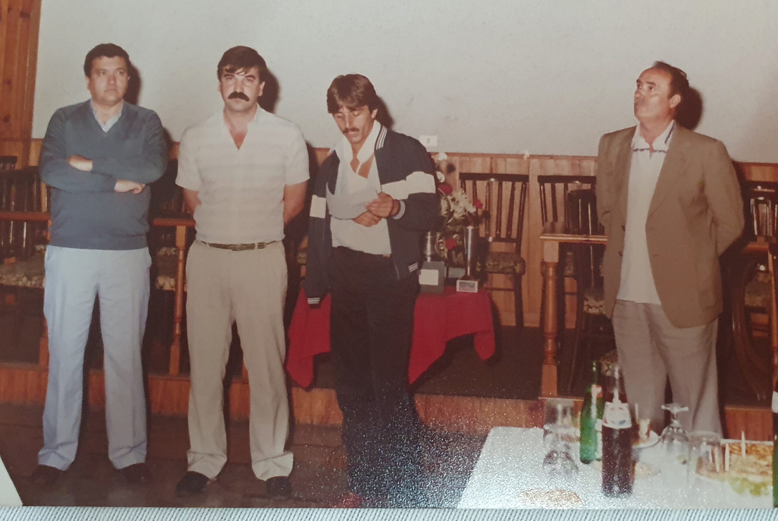 Imagen de los años SETENTA. Clausura y entrega de trofeos del CB Hércules (Icod de los Vinos) A la izquierda, Eliseo Bento Lugo, presidente de la Federación Tinerfeña; a su lado el por entonces alcalde de la localidad norteña, Carmelo Méndez Quintero. En el centro, con un brazo lesionado, un miembro del Club. A la derecha, el presidente del Colegio de Árbitros, Miguel Díez Alegre.