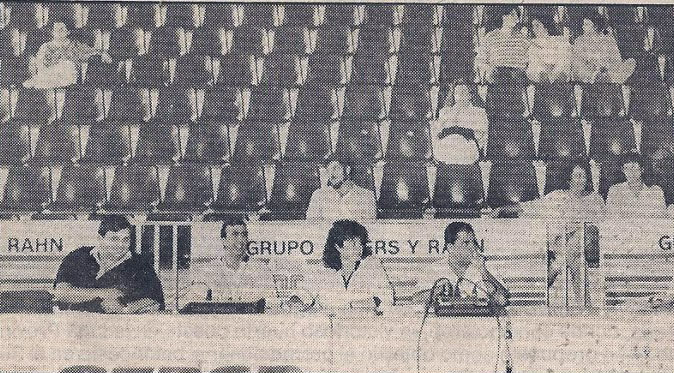 Pabellón de Deportes de Santa Cruz de Tenerife. En la mesa de anotadores, Díez Alegre (Comisario FEB), Zamorano con el crono, Beatriz Díez el acta y con el crono de 30 segundos el palmero José Ángel Perera.