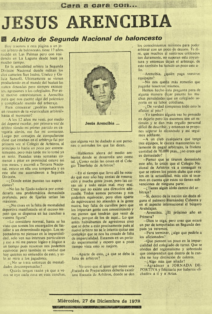 Fue publicada en Jornada Deportiva el 27 de diciembre de 1978, recién cumplidos sus 17 años el entrevistado, JESÚS LEÓN ARENCIBIA. La entrevista la hizo mi compañero Ventura González, en la vieja cancha de la calle Anchieta. Por aquel entonces arbitraba en Segunda División Nacional. ¡Va por ti, amigo CHUCHI!