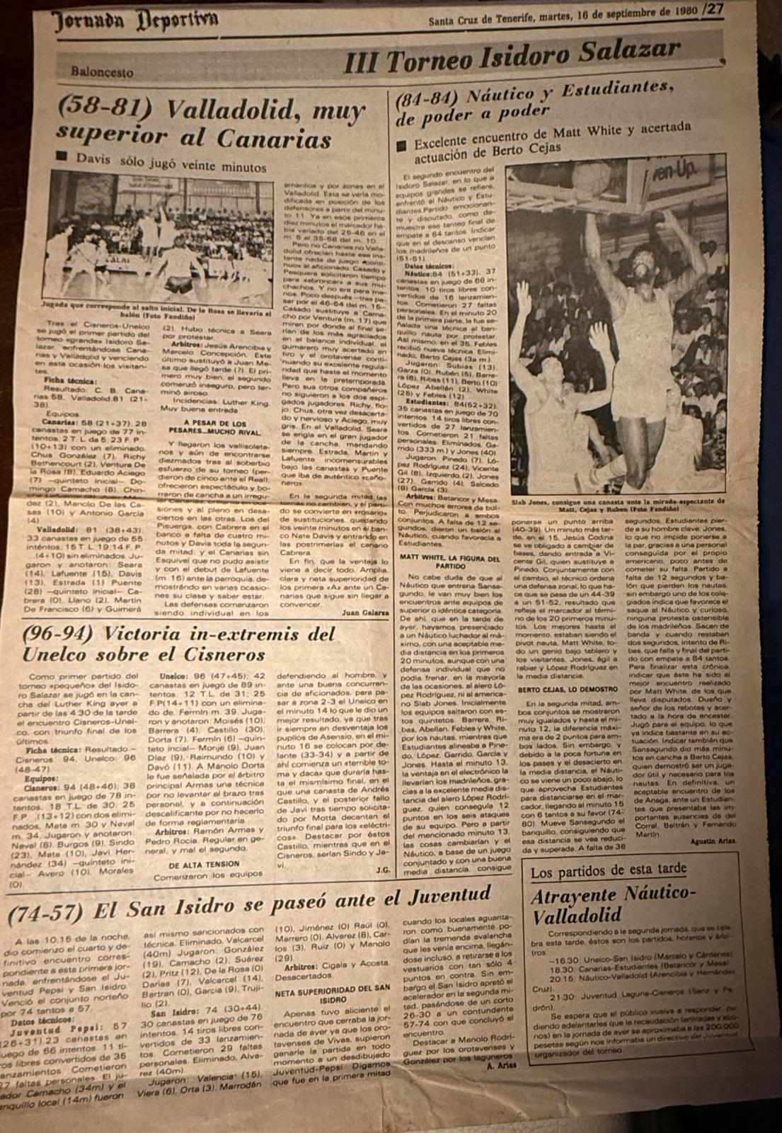 En una de las páginas de JORNADA DEPORTIVA, fechada en el mes de septiembre de 1980, figuran dos crónicas de sendos partidos de baloncesto correspondientes a la tercera edición del Memorial Isidoro Salazar, quien fuera jugador del club aurinegro, fallecido unos años antes.