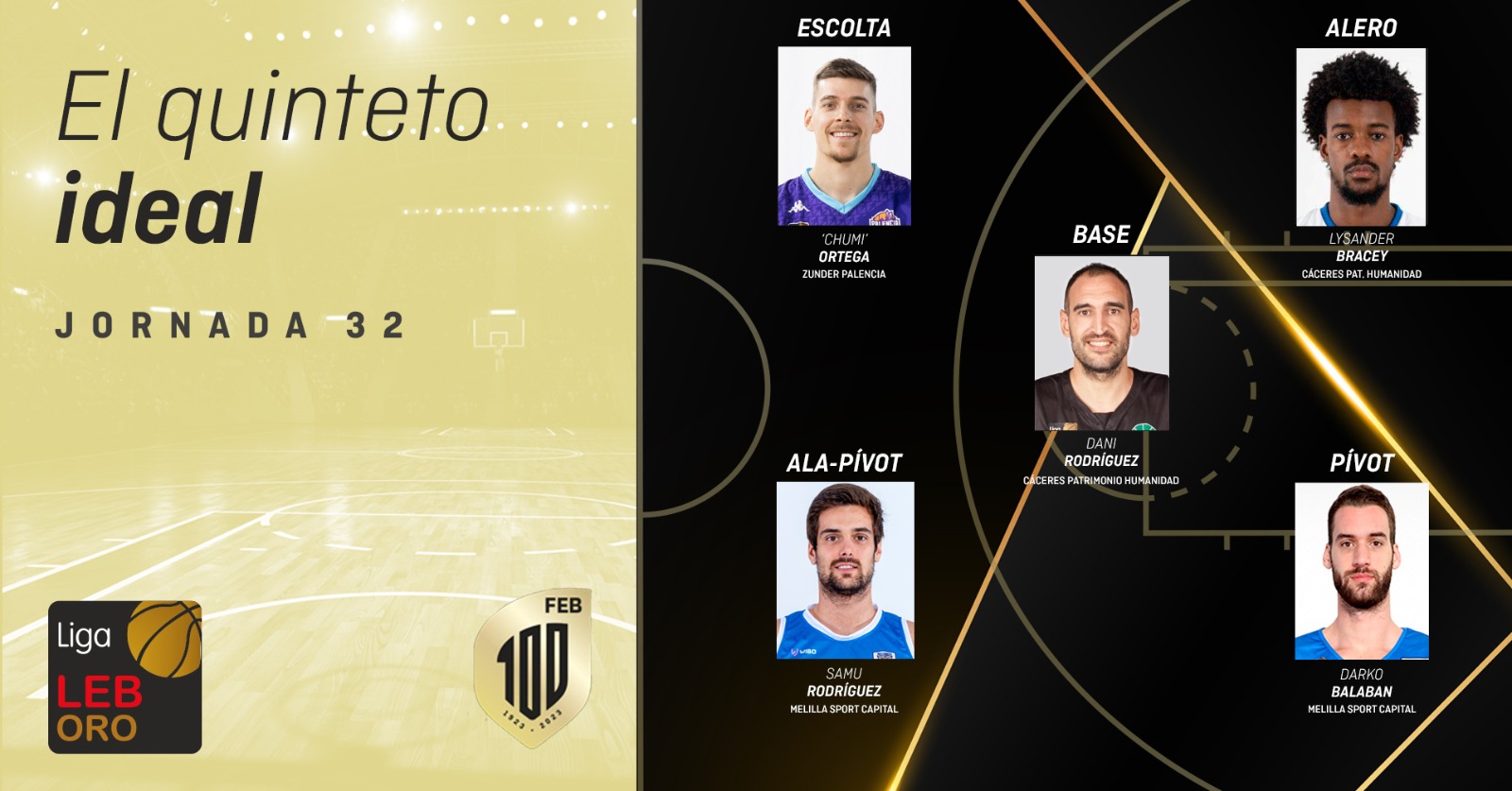 La línea exterior está formada por el ‘combo’ del Cáceres Patrimonio de la Humanidad, con Dani Rodríguez y Lysander Bracey acumulando 44 puntos entre ambos en la victoria ante el Leyma Coruña. Junto a ellos ‘Chumi’ Ortega, impidiendo el ascenso directo del Morabanc Andorra con la victoria del Zunder Palencia ante el Movistar Estudiantes. Y en el interior, los dos pívots del Melilla Baloncesto: Samu Rodríguez, haciendo daño desde el exterior con 7 triples y el MVP Darko Balaban.