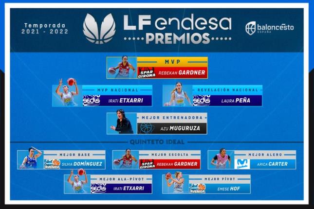 A las puertas de los Playoffs por el título en los que conoceremos al campeón de la temporada, la LF Endesa ha ido desgranando los nombres de las principales protagonistas del curso, un total de seis jugadoras que han dominado las diferentes categorías acompañadas de Azu Muguruza (IDK Euskotren) como la entrenadora más destacada. Un cuadro de honor coronado por la norteamericana Rebekah Gardner (Spar Girona) como MVP y en el que hasta tres jugadoras nacionales han demostrado su talento de futuro en la categoría.