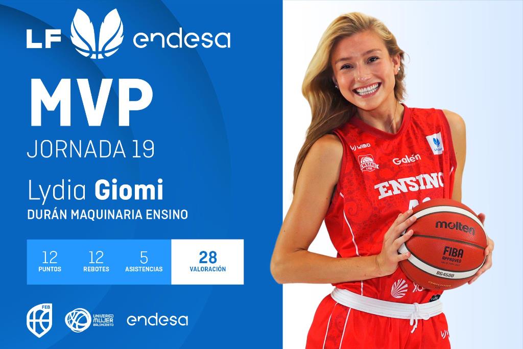 Una de ellas fue la pívot americana Lydia Giomi (ex SPAR Gran Canaria), que anotó 12 puntos (con una serie de 6 de 12 en tiros de dos), 12 rebotes, 5 asistencias, 2 recuperaciones y 3 faltas recibidas para un total de 28 puntos de valoración, el tope de la jornada y el primer MVP de la jugadora del Durán Maquinaria Ensino.