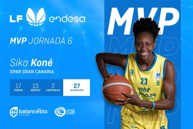 Dicen los números que el idilio de Sika Koné con el MVP lleva a la jugadora de Mali a conquistar un galardón cada siete encuentros con la camiseta del Spar Gran Canaria, pero la jugadora interior parece estar dispuesta a pulverizar este año sus propios registros en una competición en la que acumula dos premios individuales en apenas cuatro encuentros. Y ambos de manera consecutiva, algo que esta temporada tan solo había podido lograr un jugador en el baloncesto nacional, un Nick Ward (Leyma Coruña) imparable en la Liga LEB Oro durante las Jornadas 2 y 3.