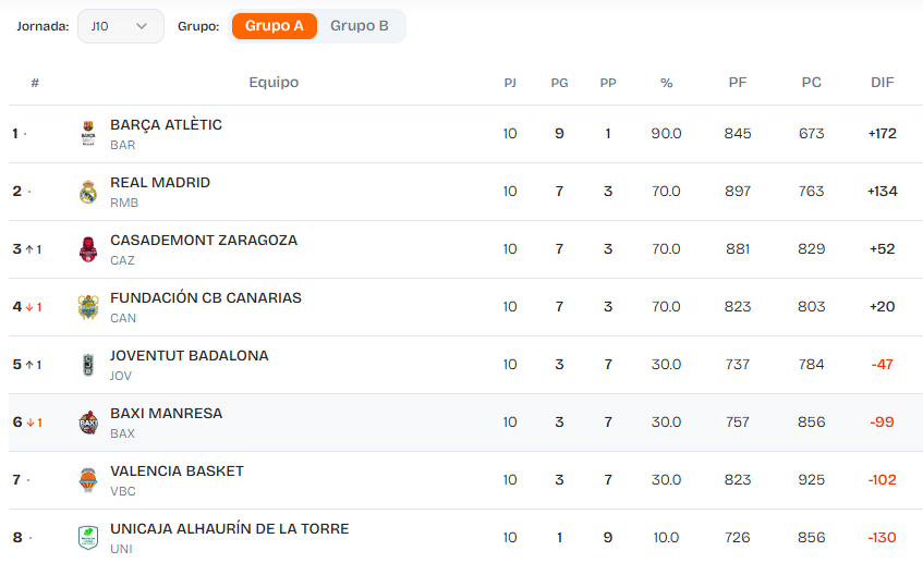 En el Grupo A, el conjunto azulgrana (9-1) cobra ventaja sobre sus inmediatos perseguidores, léase Real Madrid, Casademont Zaragoza y Fundación CB Canarias, que figuran con el balance de 7-3.