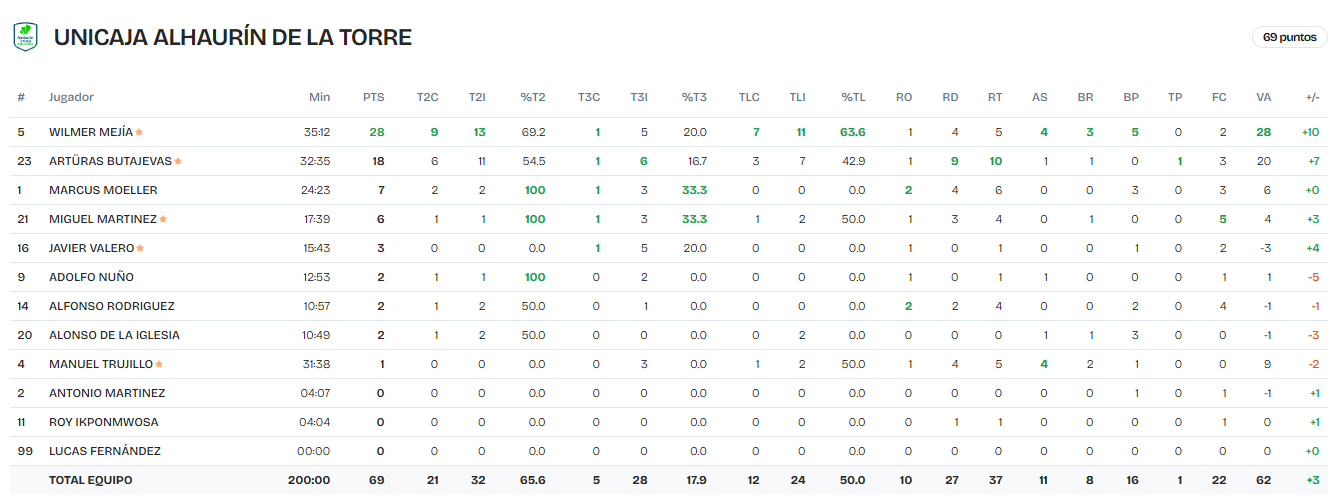 Pese a todo, la escuadra andaluza no le perdió la cara al encuentro, ahogó la salida del balón de los aurinegros y se encomendó primero al lituano Arturas Butajevas (12 puntos y 5 rebotes al descanso); y después, a Wilmer Mejía (16 puntos y 22 de valoración al intermedio), para intentar llevar el choque a su territorio.