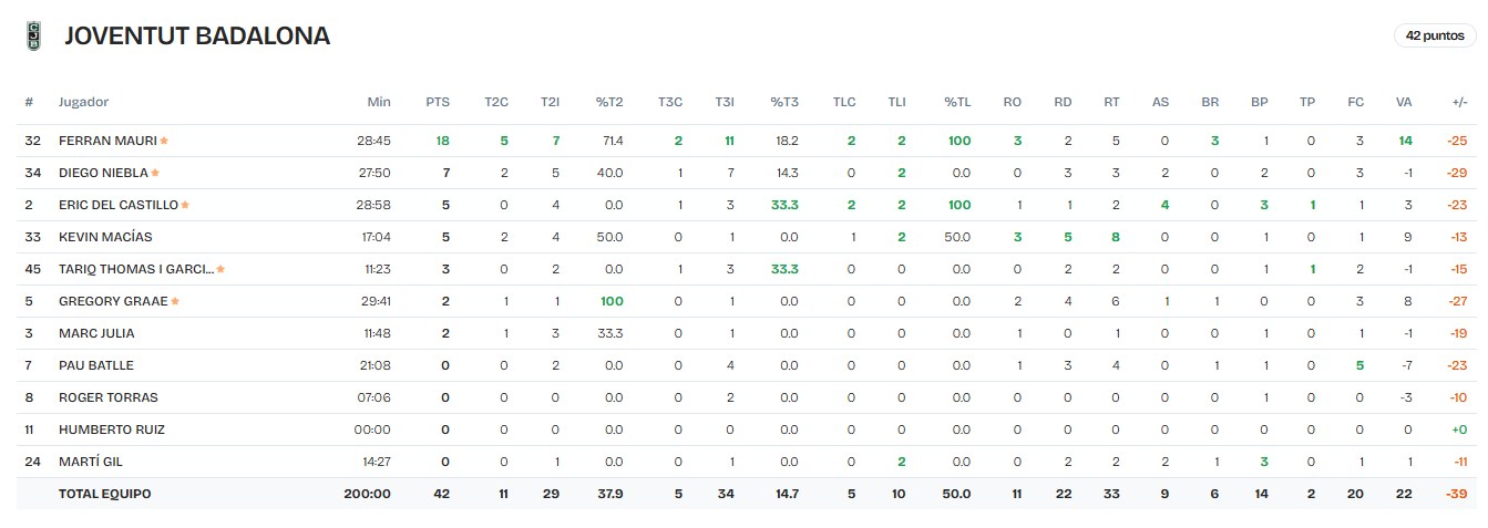 El MVP del Joventut fue su dorsal 32 Ferrán Mauri, con +14, anotando 18 puntos. Kevin Macías fue el mejor bajo los aros, con 8 capturas.