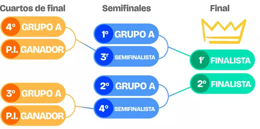 Por el otro lado del cuadro, el 3º del Grupo A jugará ante el ganador del cruce entre el 1º del Grupo B y el 6º del Grupo A; quien supere ese duelo se enfrentará en semifinales al 2º del Grupo A.