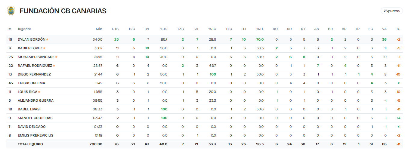 El jugador mejor valorado del encuentro fue el argentino Dylan Bordón, con +36, autor de 25 puntos, 5 rebotes y 6 asistencias, en sus 34 minutos de juego.