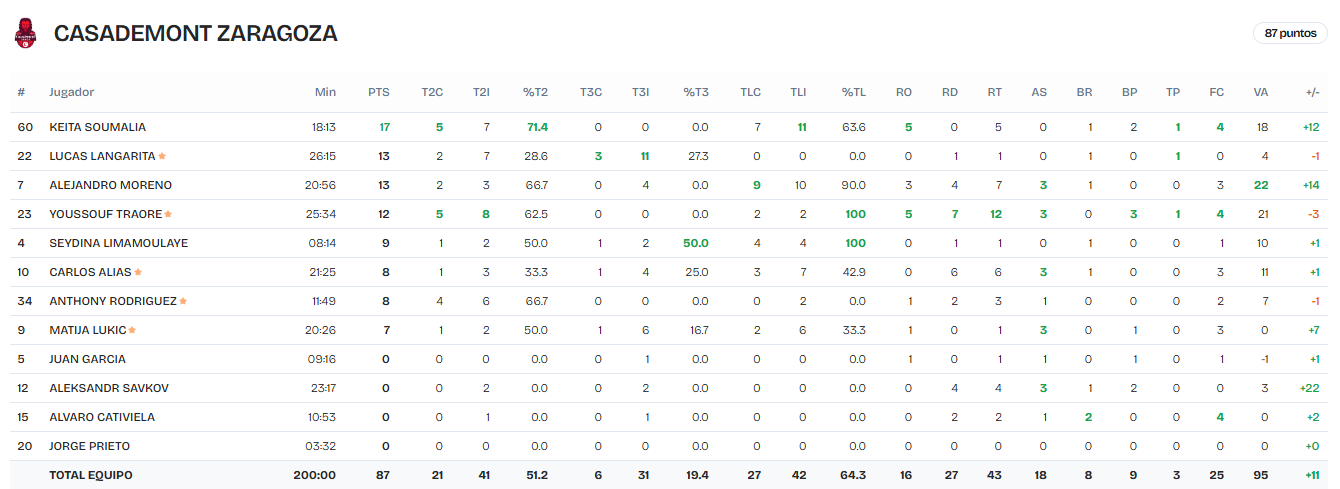 Le siguieron, con 11 tantos, Xabier Lòpez y Mohamed Sangare, máximo reboteador visitante con 8 capturas.