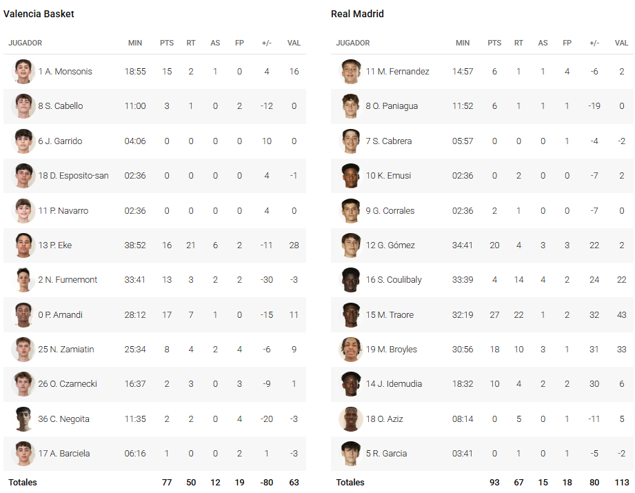 El MVP de la final, que no del torneo, fue el madridista Traore (+43) anotando 27 tantos y capturando 22 rebotes. Gómez aportó 20 puntos, por los 18 del invitado norteamericano Broyles.