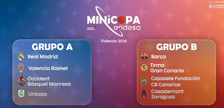 La Minicopa Endesa Valencia 2026, que se disputará del 18 al 22 de febrero en la capital del Turia, ya conoce su camino. Los Colgados del Aro Juanma López Iturriaga y Toñín Llorente fueron las manos inocentes en el sorteo de grupos, celebrado este lunes en Valencia.