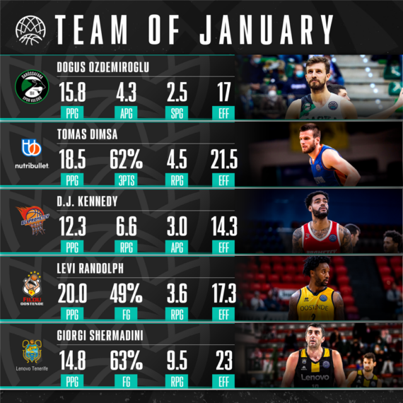 Entre los candidatos está Gio Shermadini MIES (Switzerland) - Darussafaka, Filou Oostende, Nutribullet Treviso, Prometey y Lenovo Tenerife tienen a sus jugadores en el equipo del mes de enero. Uno de esos cinco jugadores también será seleccionado como el MVP de enero. Dado que los ganadores de los grupos de la temporada regular...
