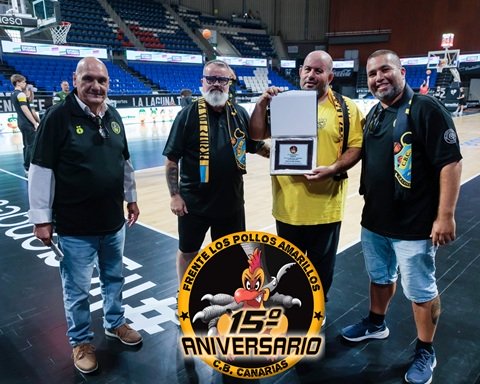 En los momentos previos al partido La Laguna Tenerife-BAXI Manresa, una representación de la Peña Frente Los Pollos Amarillos bajó al parquet para hacer entrega de una placa.