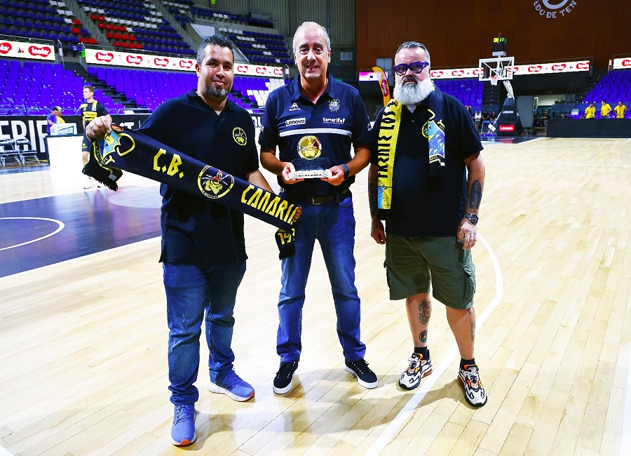 Ayer, muchos minutos antes de comenzar el partido, el presidente Jafet Ravelo y el tesorero Marcos Matías bajaron al parquet e hicieron entrega de su trofeo al entrenador-jefe de Lenovo Tenerife Txus Vidorreta. El coach vasco, como no puede ser de otra manera, lo recibió encantado y muy agradecido por el reconocimiemto.