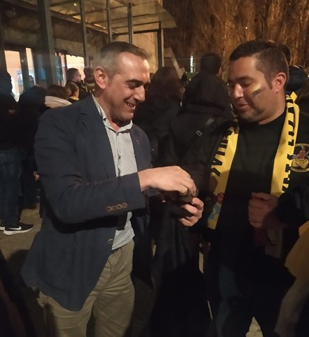 La coordinación de desplazamiento ha sido perfecto, al igual que su organización y relaciones externas. Y es que además de tener tiempo para pasear por la ciudad, disfrutar de sus monumentos, saborear la comida gallega y «mover el esqueleto» por la noche, se vivió el hermanamiento con una peña del Obradoiro, la OBRA JAZZ, con intercambio de bufandas y camisetas. Ambos grupos acudieron en caminata al Pabellón.