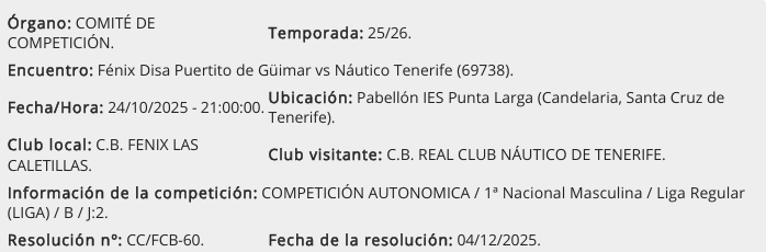 El Comité de Competición de la Federación Canaria de Baloncesto, compuesto por Carlos Zurita, José Antonio Negrín y Julio Rijo, firman la resolución del fallo correspondiente a los hechos acontecidos en el encuentro de la Primera Nacional Masculina protagonizado por los equipos Fénix DISA Puertito de Güímar y el RC Náutico de Tenerife. Un partido correspondiente a la segunda jornada del Grupo B y que finalizó con el resultado de 80 a 79 a favor del conjunto local.