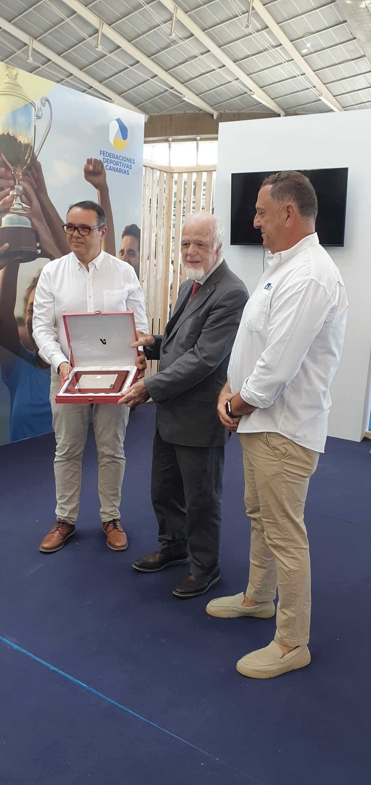 En el mismo espacio de la Federación Canaria de Baloncesto en la EXPODECA 2025, se vivió en la mañana de hoy el acto oficial de entrega de una artística placa al eterno presidente del CB Juventud Laguna, ESTEBAN AFONSO, en la que se recoge el acuerdo de Junta Directiva de conceder el título de PRESIDENTE HONORÍFICO.