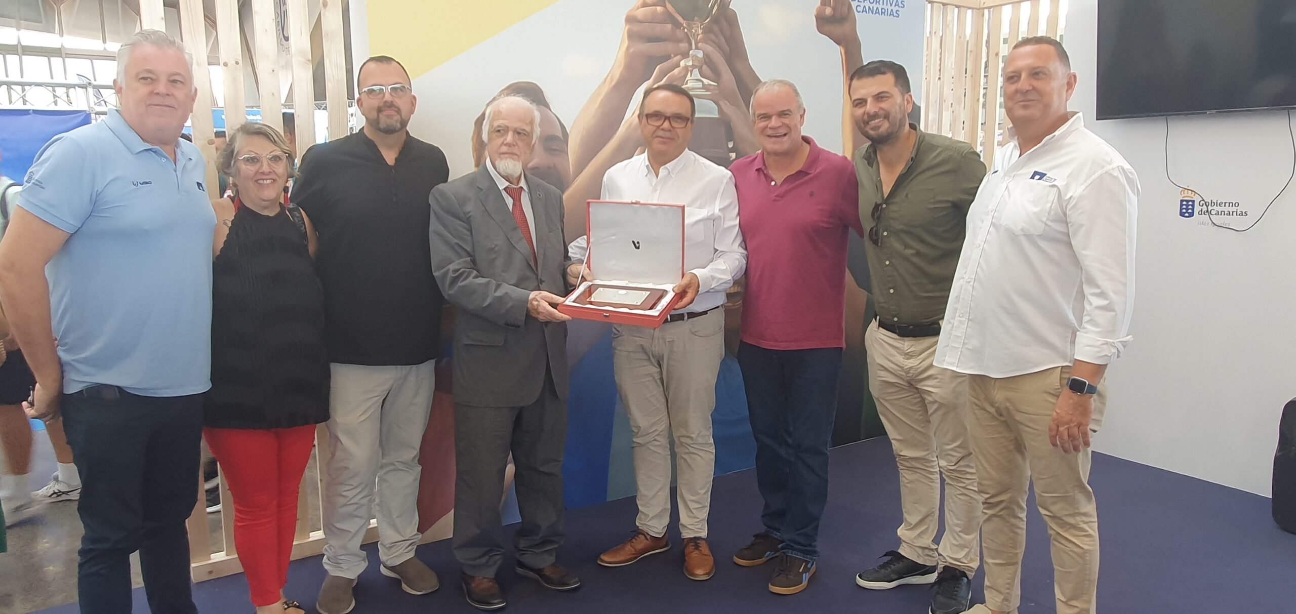 Junto a su inseparable compañera CONCHI y la presencia de sus hijos y familia, los presidentes de la FCB, Carlos Olano, y del CB Juventud Laguna, Humberto Cabrera, dedicaron unas emotivas palabras al homenajeado, valorando esos más de 50 años al frente de la directiva del Club Decano.