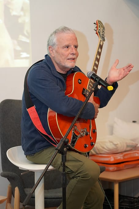 De inmediato se dio paso a la intervención musical del periodista Juan Carlos Acosta, al que Izquierdo definió como «un nómada por principios y persona inquieta por la naturaleza«, quien deleitó con la música de su sueño que salía de las cuerdas de su guitarra.
