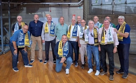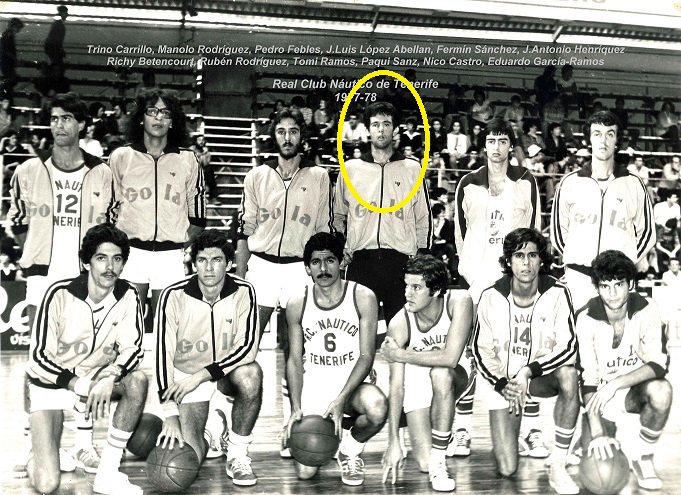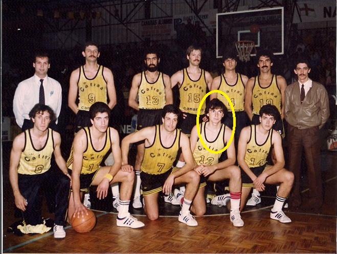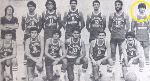 En el centro de la imagen, Juan Méndez, alias «el rana». «Made in Canary CB». Lo trajo Pepe Cabrera de La Palma siendo muy jovencito, fue júnior y subió al primer equipo. Participó en seis ascensos a Liga ACB con distintos clubes. Sus entradas a canasta siguen siendo recordadas hoy en día. En la actualidad trabaja para el CB Canarias, en el área de Eventos y Comercial.