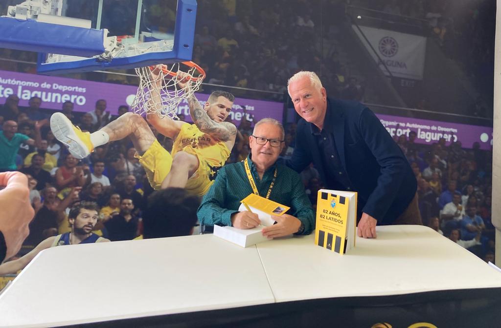Un poster gigante de Fran Guerra sirvió de fondo para que los aficionados del CB Canarias se acercaran a la mesa en la que encantado procedí a firmar ejemplares del libro «82 años, 82 latidos: Historia del CB Canarias», que escribimos José Luis Hernández y un servidor, con la aportación estadística de José Antonio Pérez Padrón.