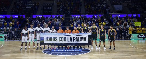 Lenovo @CB1939Canarias y @unicajaCB muestran una pancarta con un mensaje especial de apoyo y solidaridad a la La Palma.