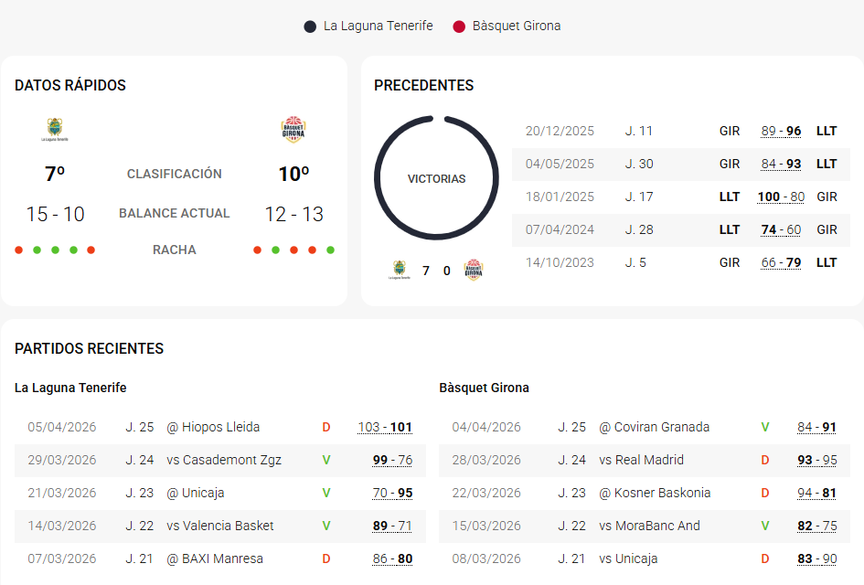 En las dos últimas visitas de Basket Girona a La Laguna las victorias locales fueron por 74-60 (23-24) y 100-80 (24-25).