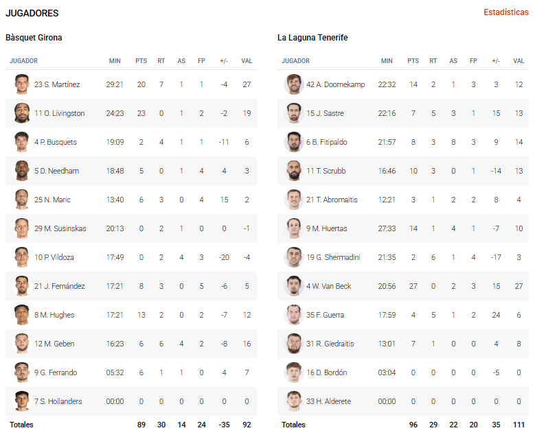 En cuanto al choque de la primera vuelta, en cancha catalana, triunfo tinerfeño por 89-96, con los puntos repartidos así: