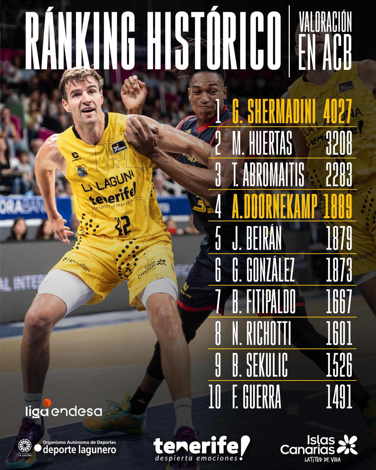 En su séptima campaña en el club lagunero, Doornekamp ya solo tiene por delante a sus compañeros Shermadini, Huertas y Abromaitis.