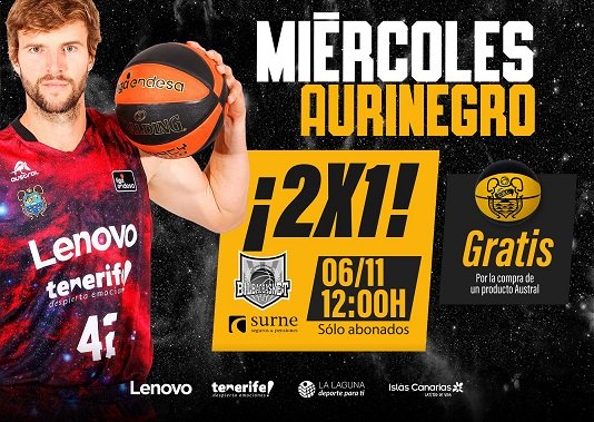 El Lenovo Tenerife retoma los «Miércoles Aurinegros». El club canarista lanzará este miércoles día 2 de noviembre una promoción especial para abonados de 2×1 en entradas, sólo válida ese día, de cara al atractivo choque liguero del próximo domingo, ante el Surne Bilbao Basket (Santiago Martín, 12:00 horas).