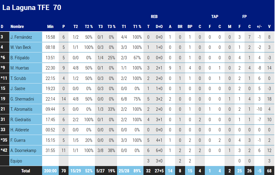70 – La Laguna Tenerife (13+16+19+22): Filtipaldo (5), Huertas (9), Scrubb (4), Guerra (5), Doornekamp (11) -inicial- Fernández (6), Van Beck (5), Shermadini (14), Abromaitis (5), Giedraitis (5).