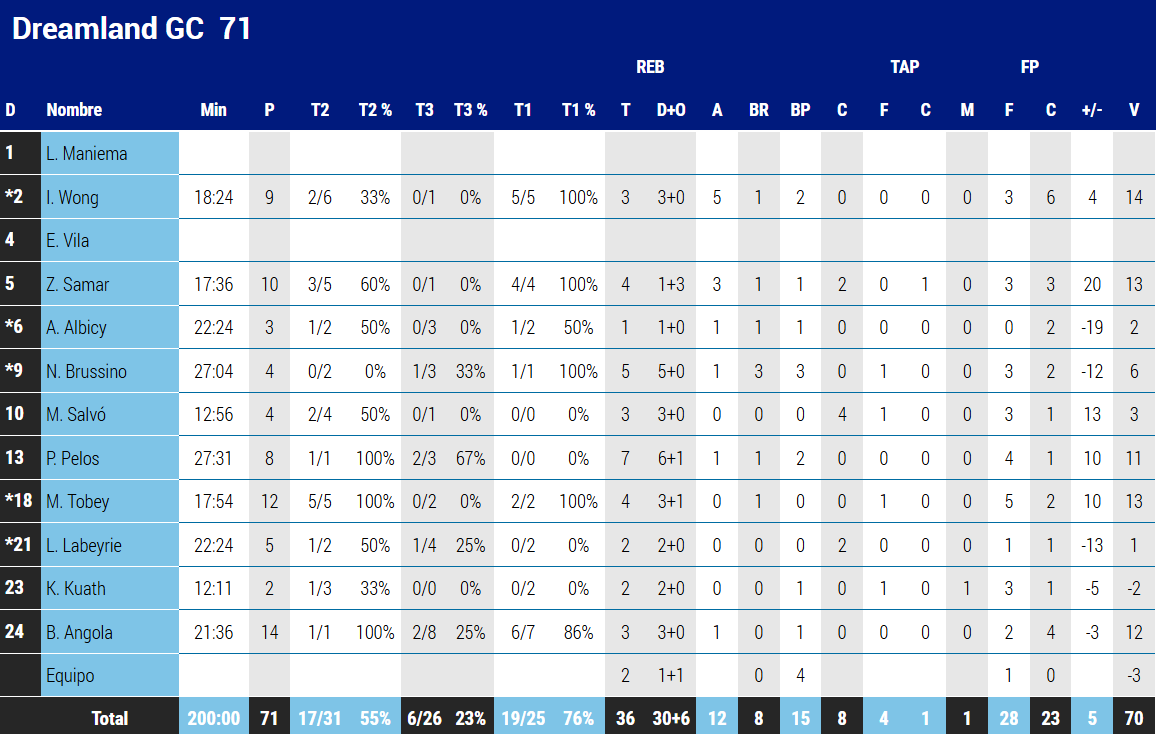 71 – Gran Canaria (9+21+26+15): Wong (9), Albicy (3), Brussino (4), Tobey (12), Labeyrie (5) -inicial- Samar (10), Salvó (4), Pelos (8), Kuath (2), Angola (14).