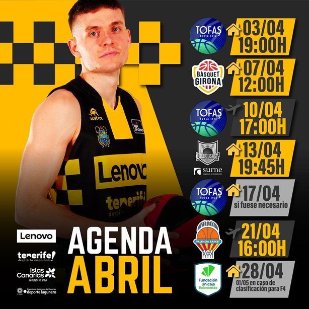 Un total de cinco/seis partidos (que puede aumentarse a ocho si se clasifica para la Final Four de Belgrado) esperan al CB Canarias (Lenovo Tenerife) en este mes de abril.