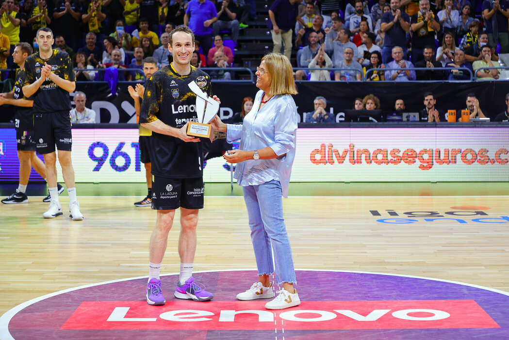 El Pabellón Santiago Martín ha vivido este domingo, en los prolegómenos del encuentro que ha enfrentado a Lenovo Tenerife y Real Madrid, la entrega a Marcelinho Huertas del trofeo que conquistó la pasada temporada al proclamarse Mejor Jugador Latinoamericano de la misma.