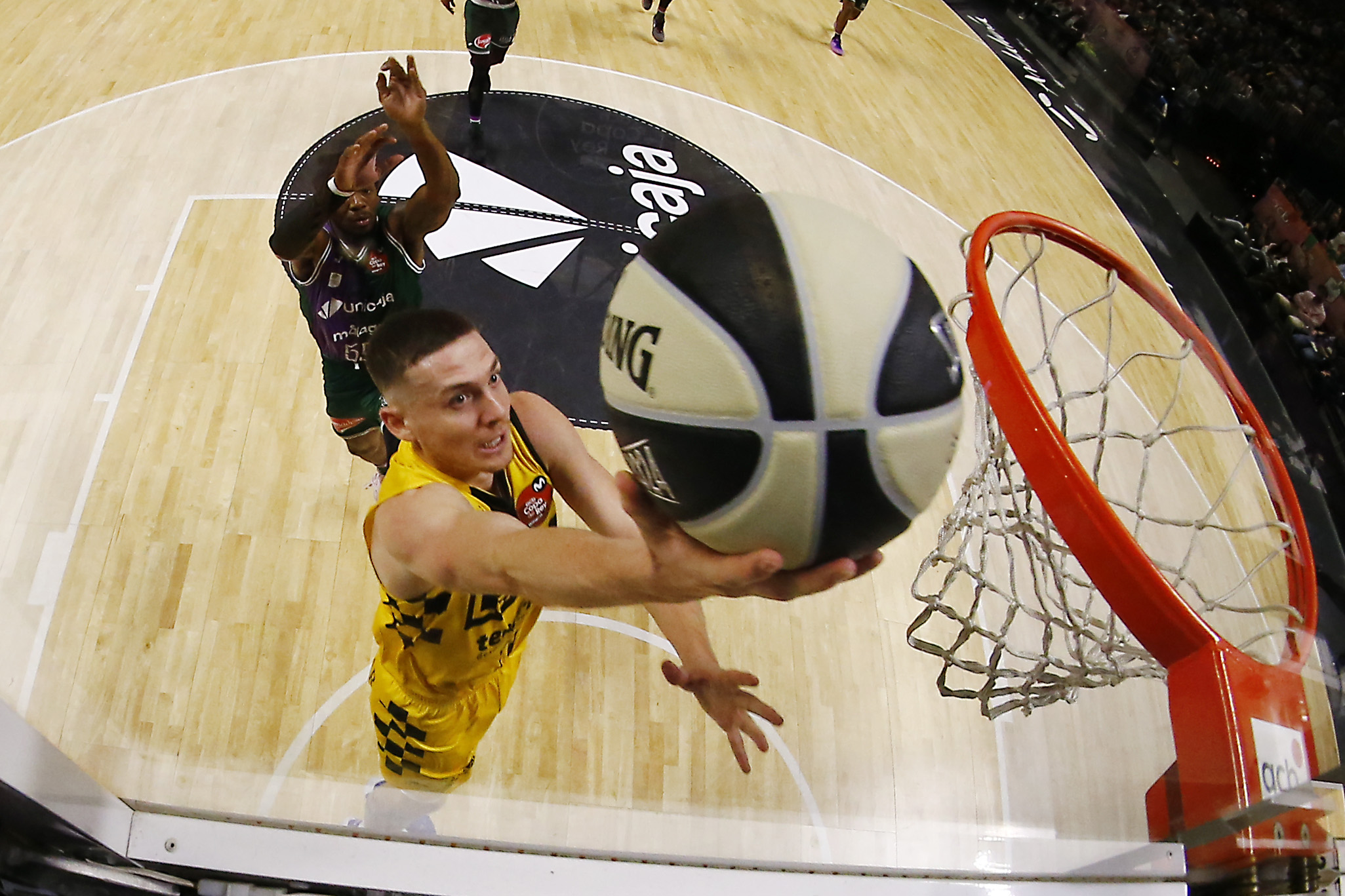 Kyle Guy, con el balón con el que se juega la Copa del Rey de Málaga. / CARSTEN W. LAURITSEN