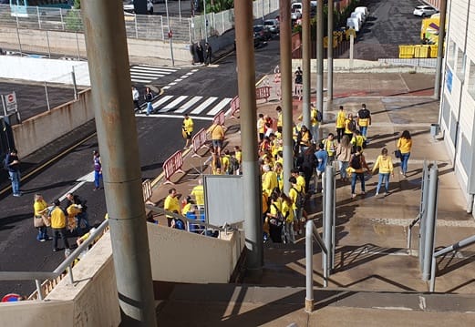 Los aficionados del Gran Canaria llegaron alrededor de las 10:15 horas al pabellón Santiago Martín. Tras bajarse de las dos guaguas, la foto de rigor en las escalinatas del recinto deportivo.