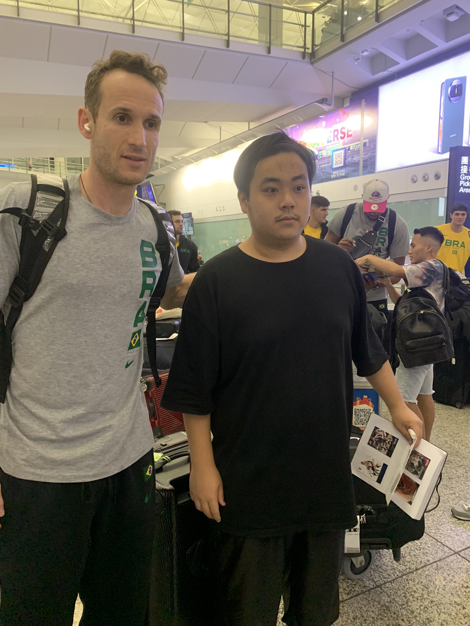 El jugador del CB Canarias MARCELINHO HUERTAS, que ha llegado con su selección de Brasil a China para disputar los últimos partidos de preparación de cara a la Copa del Mundo, se ha encontrado en el aeropuerto con un buen número de aficionados al baloncesto deseosos de fotografiarse con el base.