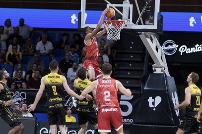 Triple de Jaime; robo del dorsal 3 y «alley-oop» que completa el lituano, quien, en el siguiente ataque, tras una gran defensa, clava desde el 6,75 para el 91 a 74 a 4 minutos.