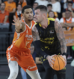 La igualdad era máxima. Los tinerfeños movían con paciencia el balón hasta encontrar buenas opciones de tiro y mantenían un alto porcentaje de acierto desde todas las líneas. Eso les permitía mandar tímidamente en el marcador, mientras el Valencia Basket se mostraba algo más errático en el tiro (25-28 min. 10). Acababa así el primer cuarto.