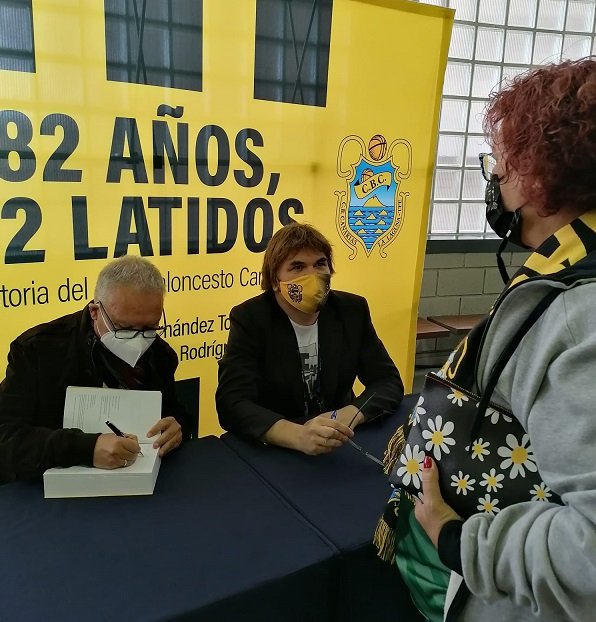 En los prolegómenos y en el descanso del encuentro Lenovo Tenerife-Barcelona tuvo lugar en el hall del segundo anillo, junto al stand del CBC, la firma de ejemplares del libro «82 años, 82 latidos», que recoge la historia del club lagunero, con 1.029 páginas y sus «dos kilos» de peso.