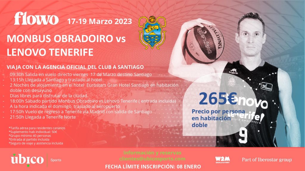 Tras la buena acogida del reciente viaje a Lugo, Úbico Sports, división especializada en viajes corporativos, ha lanzado una oferta para viajar a Santiago de Compostela y asistir a la visita del Lenovo Tenerife al Monbus Obradoiro, correspondiente a la 23ª jornada de la Liga Endesa y encuentro previsto para el sábado 18 de marzo (Fontes do Sar, 17:00 hora insular).