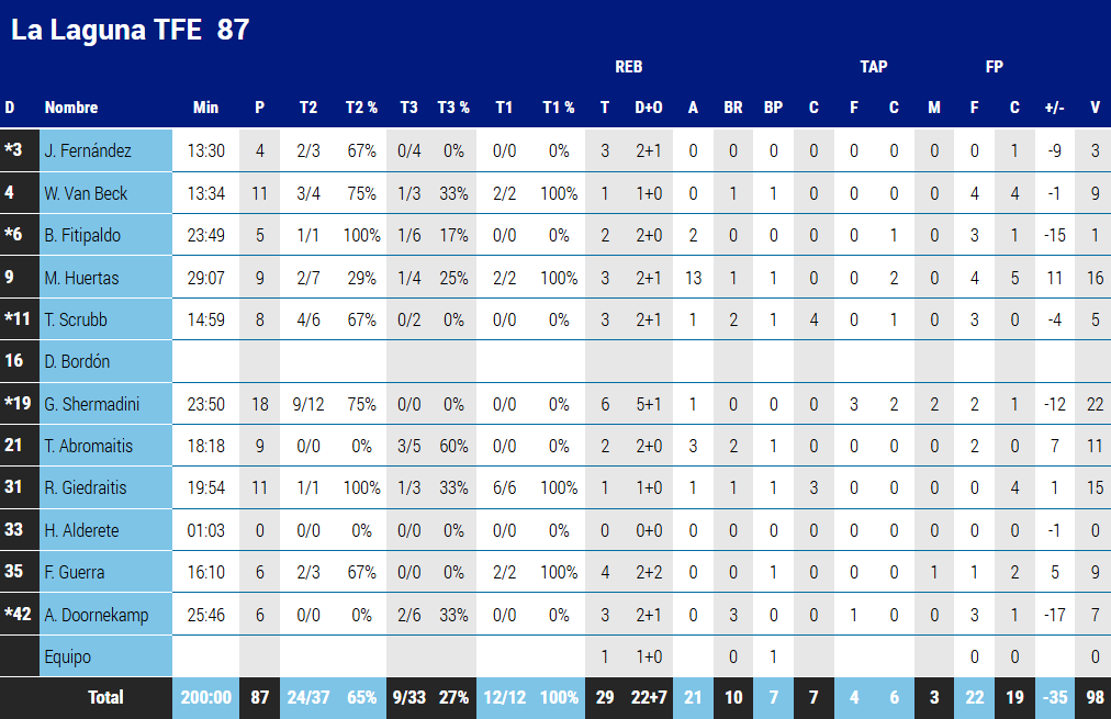 87 – La Laguna Tenerife (28+21+22+16): Fitipaldo (5), Fernández (4), Scrubb (8), Doornekamp (6), Shermadini (18) -inicial-, Van Beck (11), Huertas (9), Abromaitis (9), Guerra (6, Alderete (-) y Giedriatis (11).