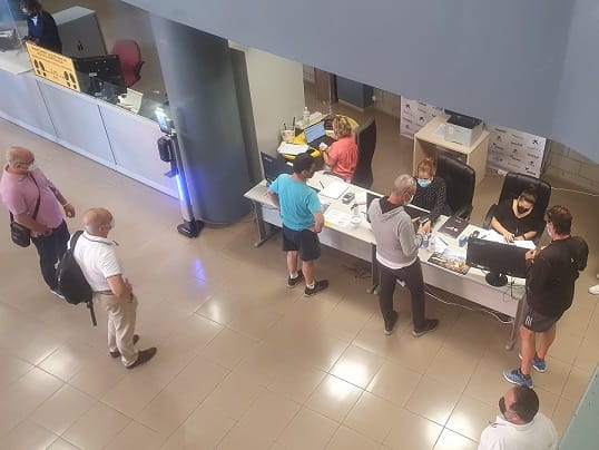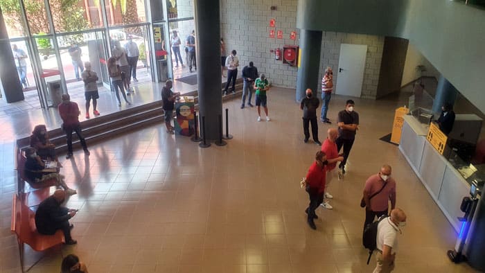 Aficionados que han preferido asistir personalmente a las oficinas del CB Canarias para disponer de la nueva tarjeta de abonado, resolviendo a la vez los descuentos acumulados en la Auritarjeta (dinero devuelto al no poder asistir por la pandemia a los encuentros de la segunda vuelta de la 19/20), además de la deducción si se es jubilado, desempleados, discapacitados o familias numerosas.