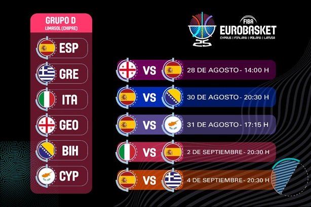 La FIBA ha hecho públicos este miércoles los horarios para el Eurobasket 2025. Un torneo en el que España iniciará la defensa de su cuarta corona de campeón, lograda hace tres años en Berlín, en Limasol (Chipre). Allí disputará el Grupo C junto con Grecia, Italia, Georgia, Bosnia-Herzegovina y uno de los cuatro países anfitriones de la cita, el debutante Chipre.