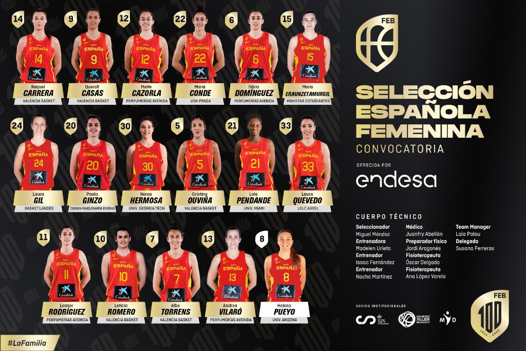 El Seleccionador Nacional, Miguel Méndez, y su cuerpo técnico han confeccionado una lista de 16 jugadoras para la preparación del Eurobasket 2023. Con la capitana Silvia Domínguez al frente, la lista la forman en su mayoría jugadoras habituales a las que se unen otras más jóvenes que han debutado recientemente con la Selección, como María Eraunzetamurgil o Lola Pendande. La novedad de la lista la pone Helena Pueyo, que estará por primera vez con el equipo.