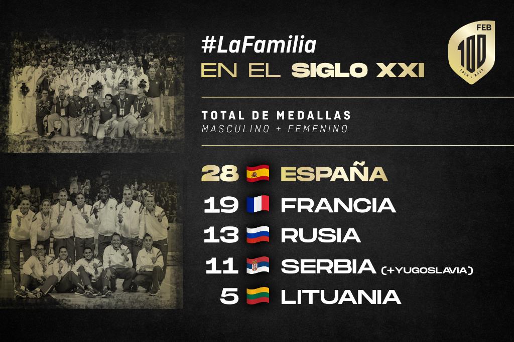 Un total de 28 medallas (9 de ellas de oro) han encumbrado a España a la condición de nº1 indiscutible entre las Selecciones Absolutas europeas en este siglo XXI. Ningún otro país, de los 14 que han conquistado al menos una medalla, presenta registros equiparables.